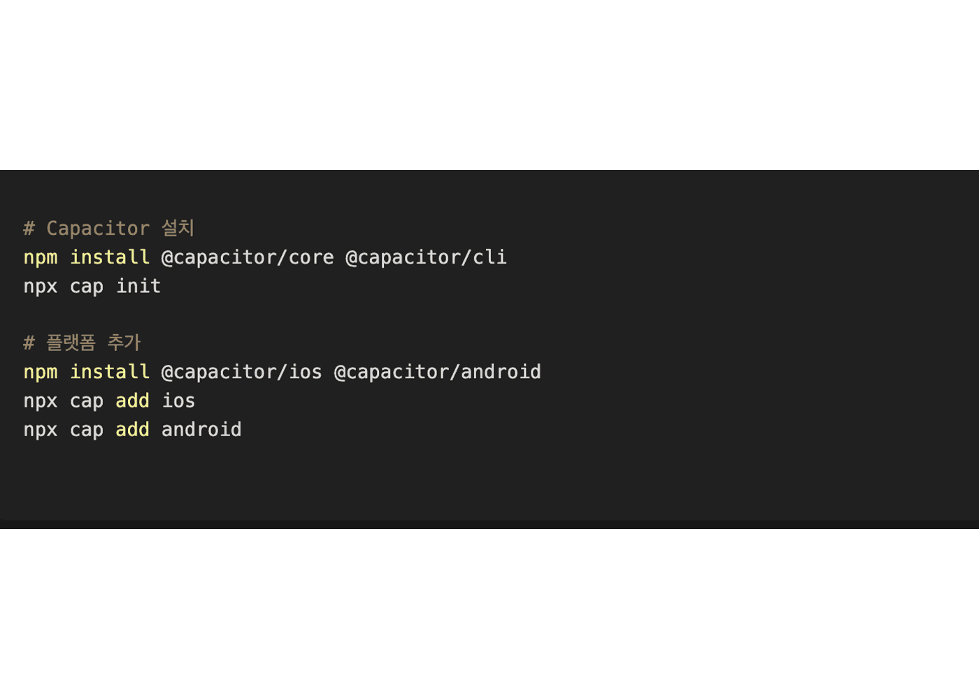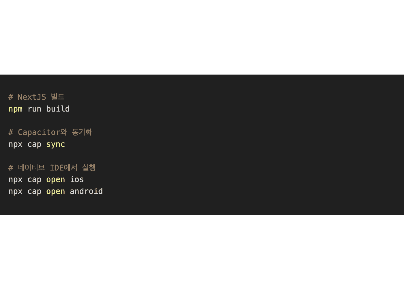 Next.js에서는 output: 'export'를 설정해야 해요. Capacitor로 패키징하려면 정적 파일로 빌드돼야 하거든요.