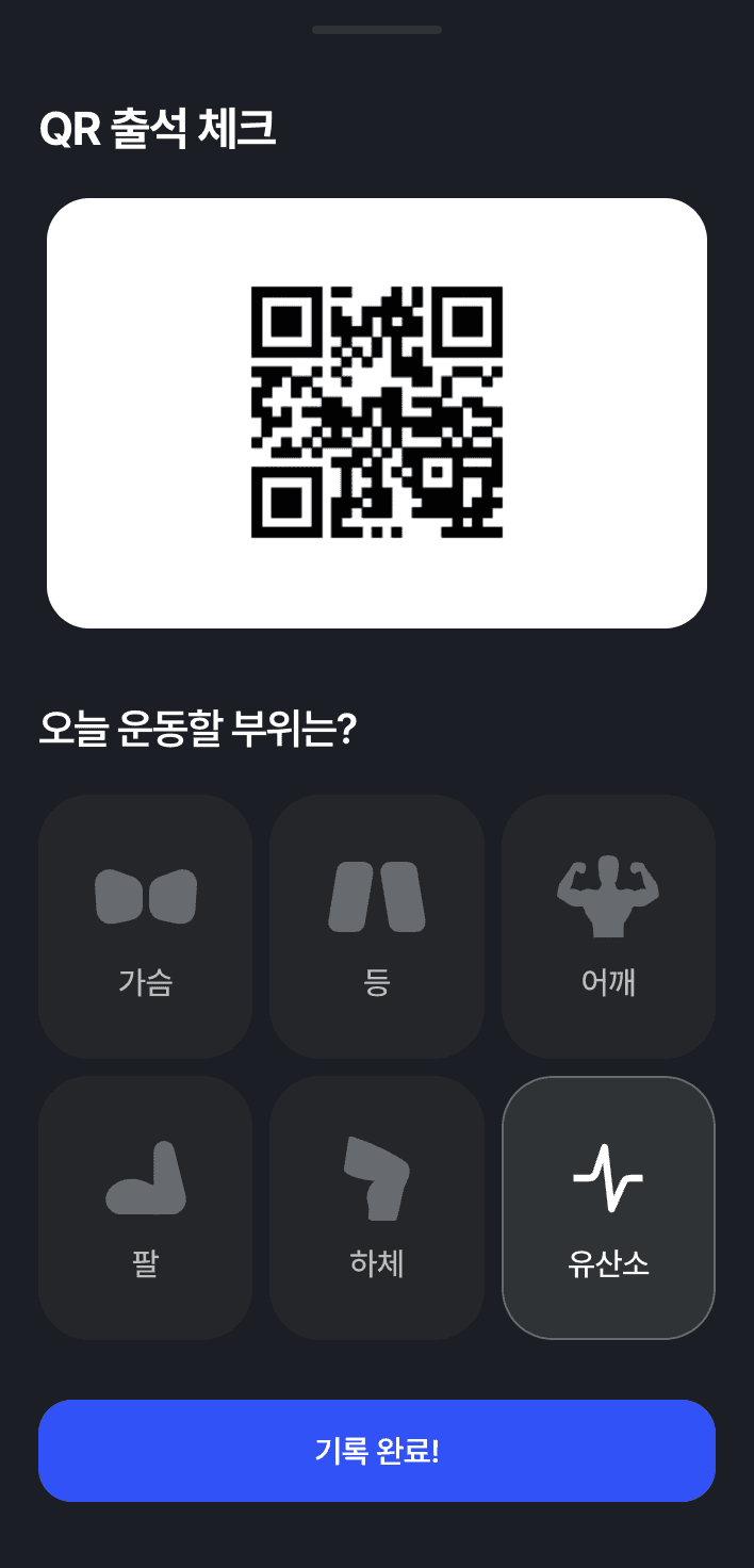 홈 탭에서는 헬스장 출석 일정과 헬스장 혼잡도를 한눈에 확인할 수 있어요. 헬스장 혼잡도는 QR 입장 데이터를 바탕으로 시간대별로 시각화돼서, 사용자들이 덜 붐비는 시간에 운동할 수 있도록 안내해줘요.