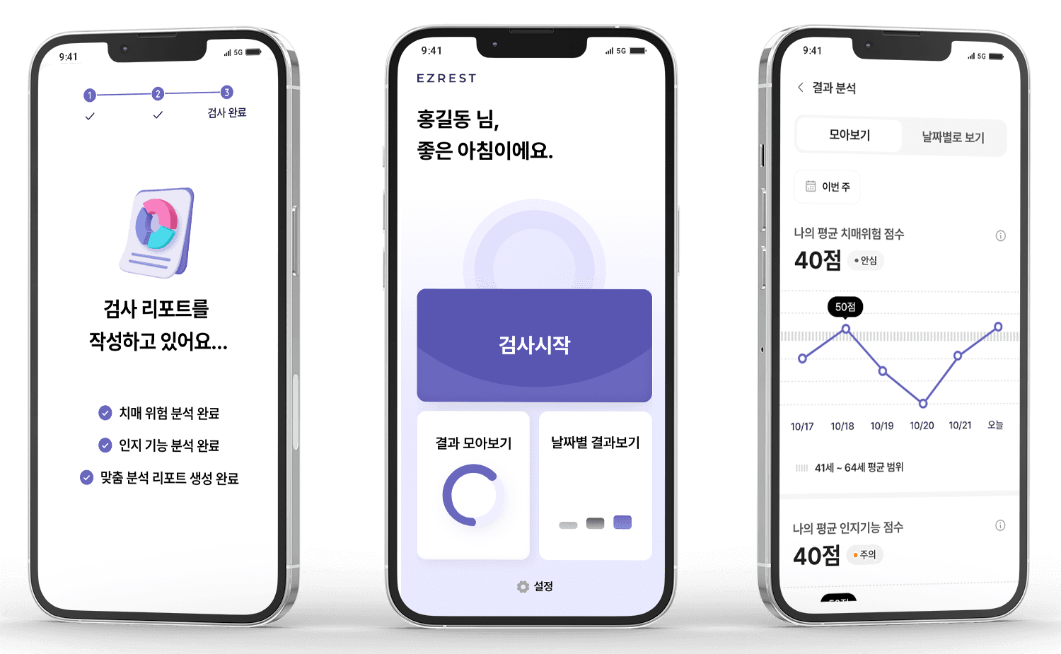 Design 서비스의 인터페이스는 시니어 사용자를 중심으로 설계했어요. 큰 글자 크기, 높은 색상 대비, 간결한 메뉴 구성 등으로 시니어 사용 편의성을 고려하였습니다. 검사 결과는 사용자의 연령대 평균 또는 개인의 이전 기록과 비교하여 제공되며, 자신의 상태를 한눈에 파악하고 변화를 추적할 수 있도록 했어요.