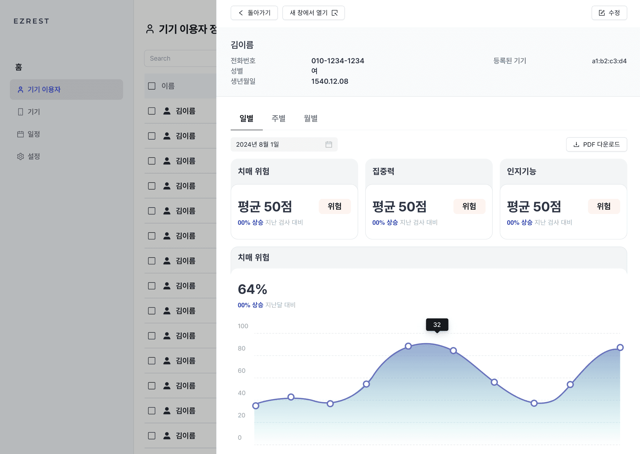 Design Ezrest는 가장 먼저 어르신들을 보호 관리하는 기관 대상으로 사용될 예정이었기에, 기관에서 어르신들의 검사 데이터를 쉽게 확인하고 출력할 수 있도록 하는 어드민 페이지가 필요했어요.