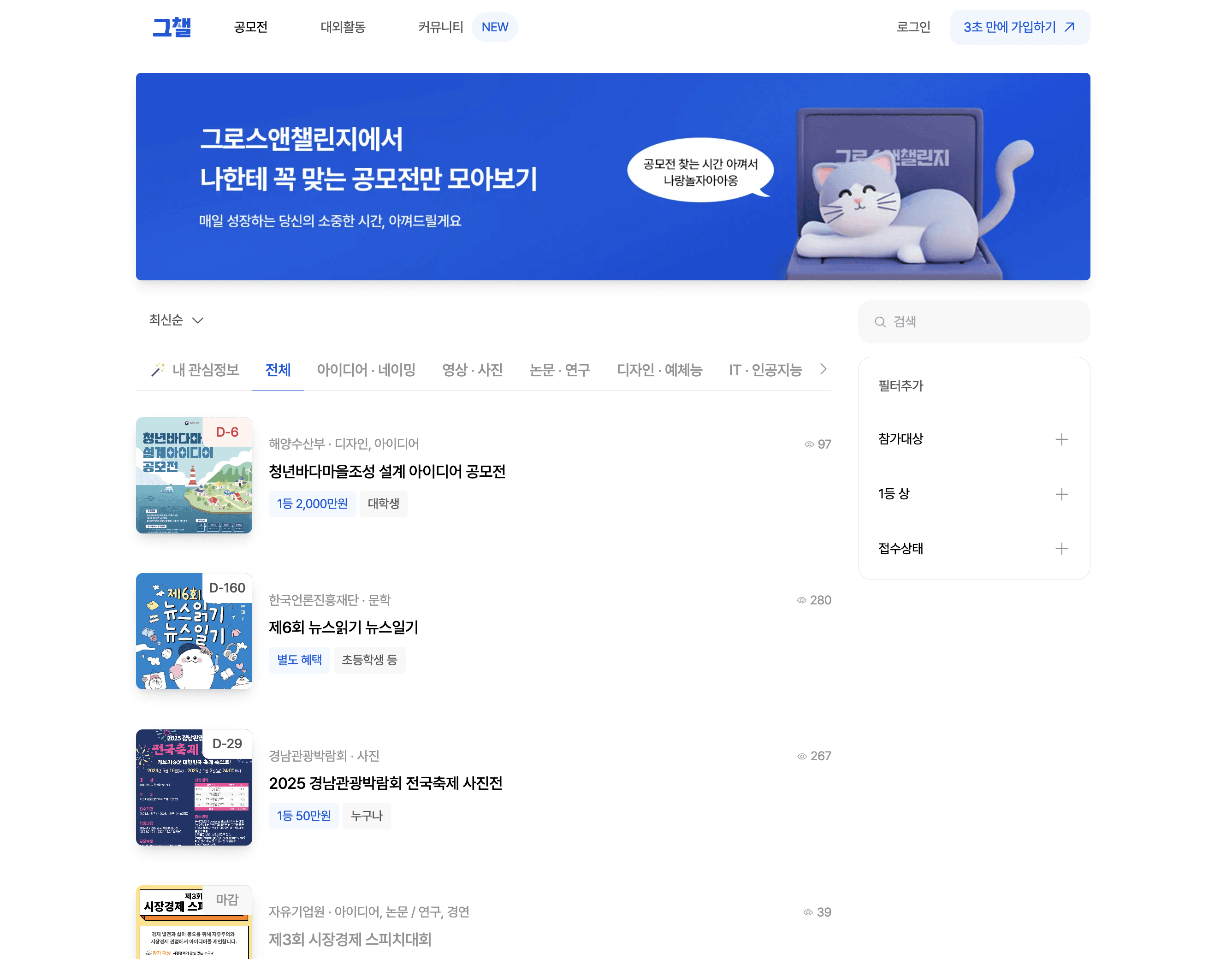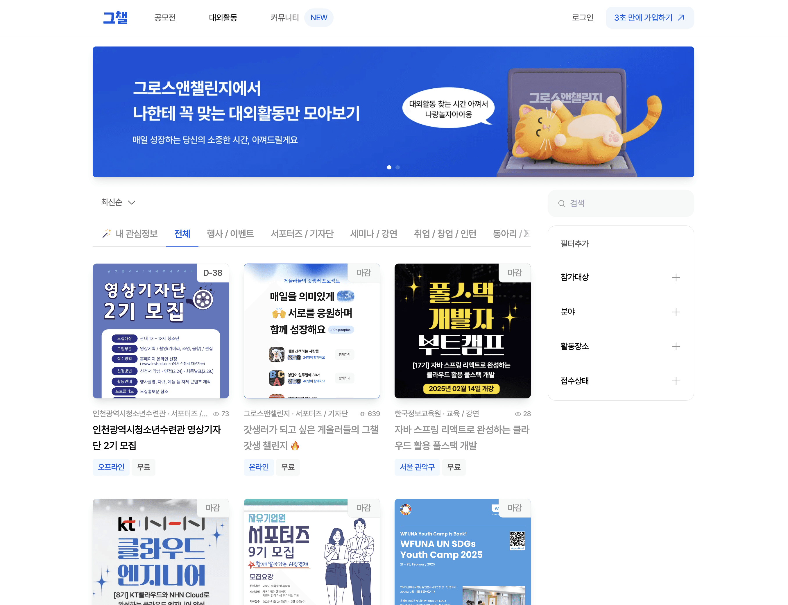 그로스앤챌린지는 "세상에서 가장 편한 공모전, 대외활동 찾기"라는 모토 아래, 120명 이상의 대학생을 대상으로 설문조사를 진행하며 만들어졌어요. 운영을 시작한 지 3개월 만에 유저 수 600명을 달성했고, 주 타겟 유저인 대학생 분들의 뜨거운 관심을 통해 큰 보람을 느낄 수 있었던, 매우 의미 있는 프로젝트였습니다.