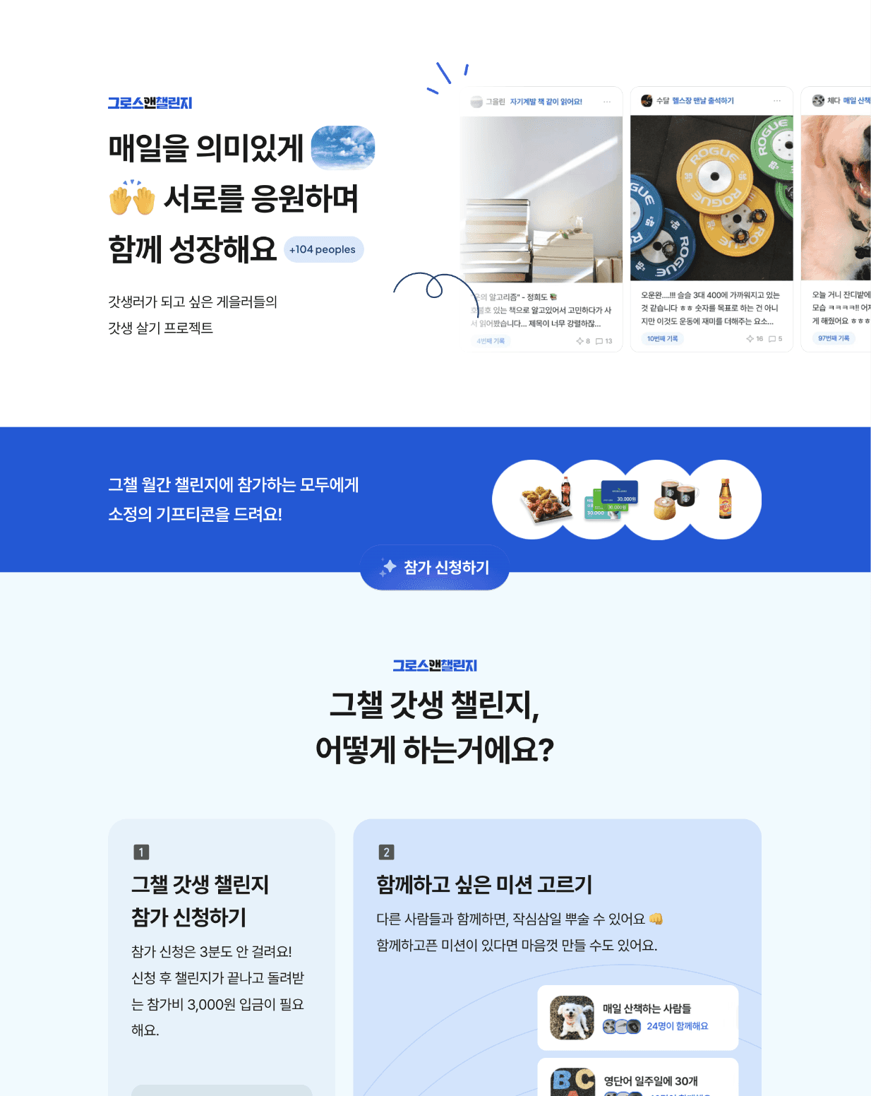 Design 그로스앤챌린지를 주도적으로 만들고, 운영해나가는 과정에서 유저들의 더 잦은 방문을 유도하기 위한 재미있는 마케팅 이벤트를 진행했었는데요, 당시 유행하던 '갓생' 키워드를 이용한 '그챌 갓생 챌린지' 입니다.