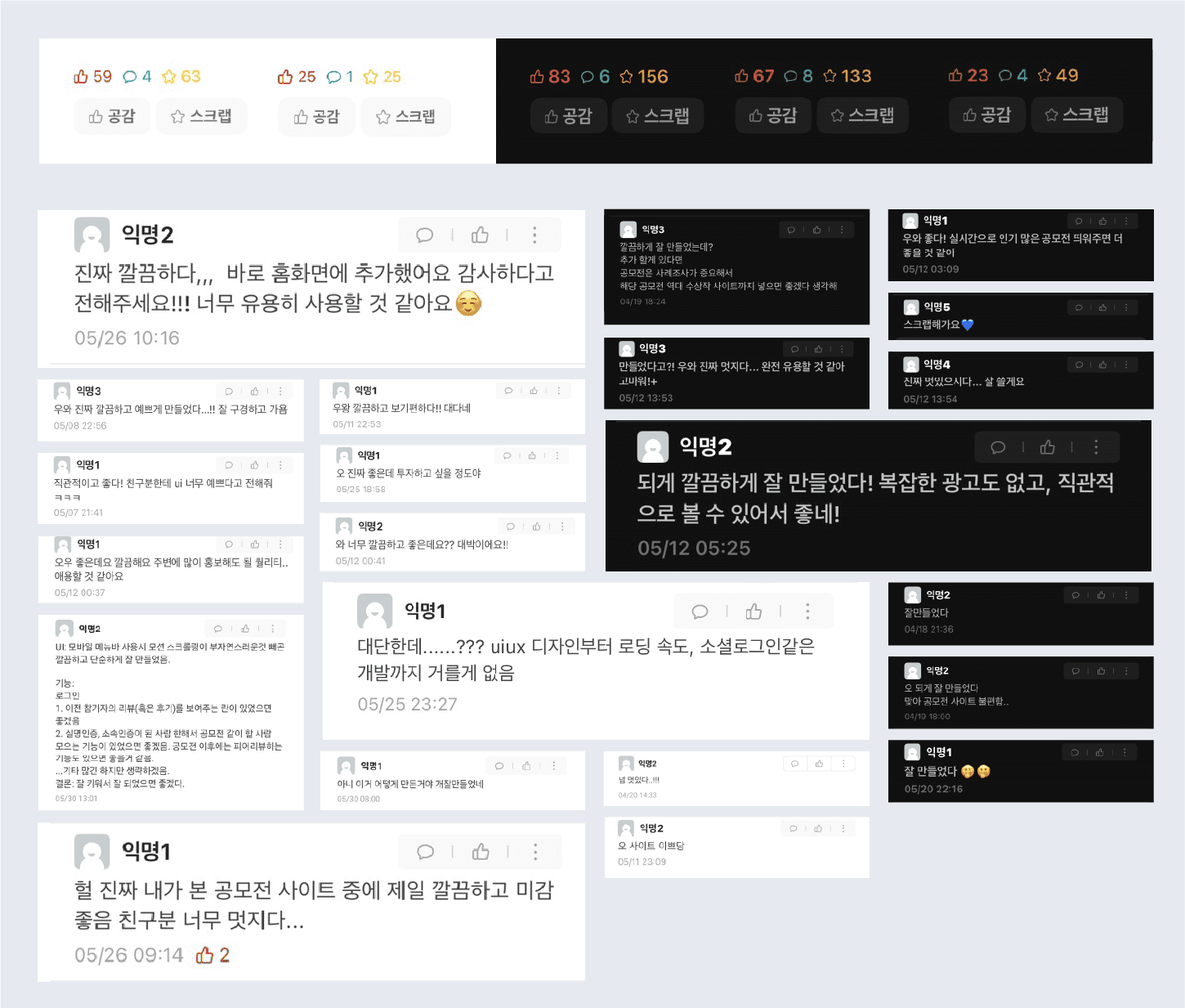 그로스앤챌린지는 운영 3개월 만에 회원가입 유저 600명을 모으며 정말 빠르게 성장했어요. 특히 숙명여대, 성신여대, 경상국립대, 덕성여대에 업로드 된 에브리타임 글에서만 총 좋아요 250개, 스크랩 379회의 기록을 남기며 대학생들의 뜨거운 관심을 받았는데요, 남겨주신 구체적인 피드백과 칭찬들 덕에 팀원들 모두 큰 보람을 느낄 수 있었어요.