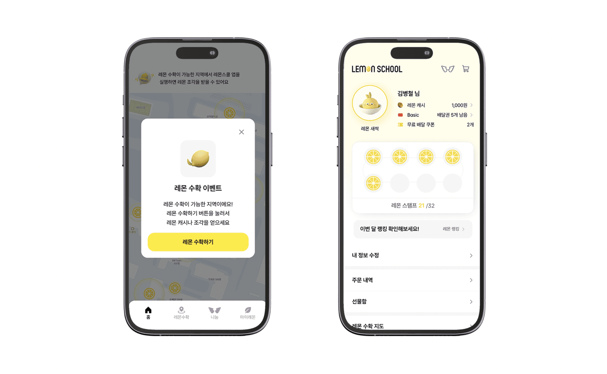 학교 구성원들이 앱을 지속적으로 이용할 수 있도록 ‘레몬 수확’ 기능을 추가했는데요, 사용자는 앱 내 특정 위치를 방문하면 랜덤으로 레몬 조각 또는 레몬 캐시를 획득할 수 있으며, 이를 통해 서비스 이용 경험을 더욱 흥미롭게 만들었어요. 수확 위치는 AWS Lambda 스케줄링을 활용해 매일 자정마다 자동으로 변경되도록 구현했어요. 이를 통해 사용자들이 반복적인 행동 패턴을 가지지 않고, 다양한 장소에서 앱을 활용하도록 유도했어요.