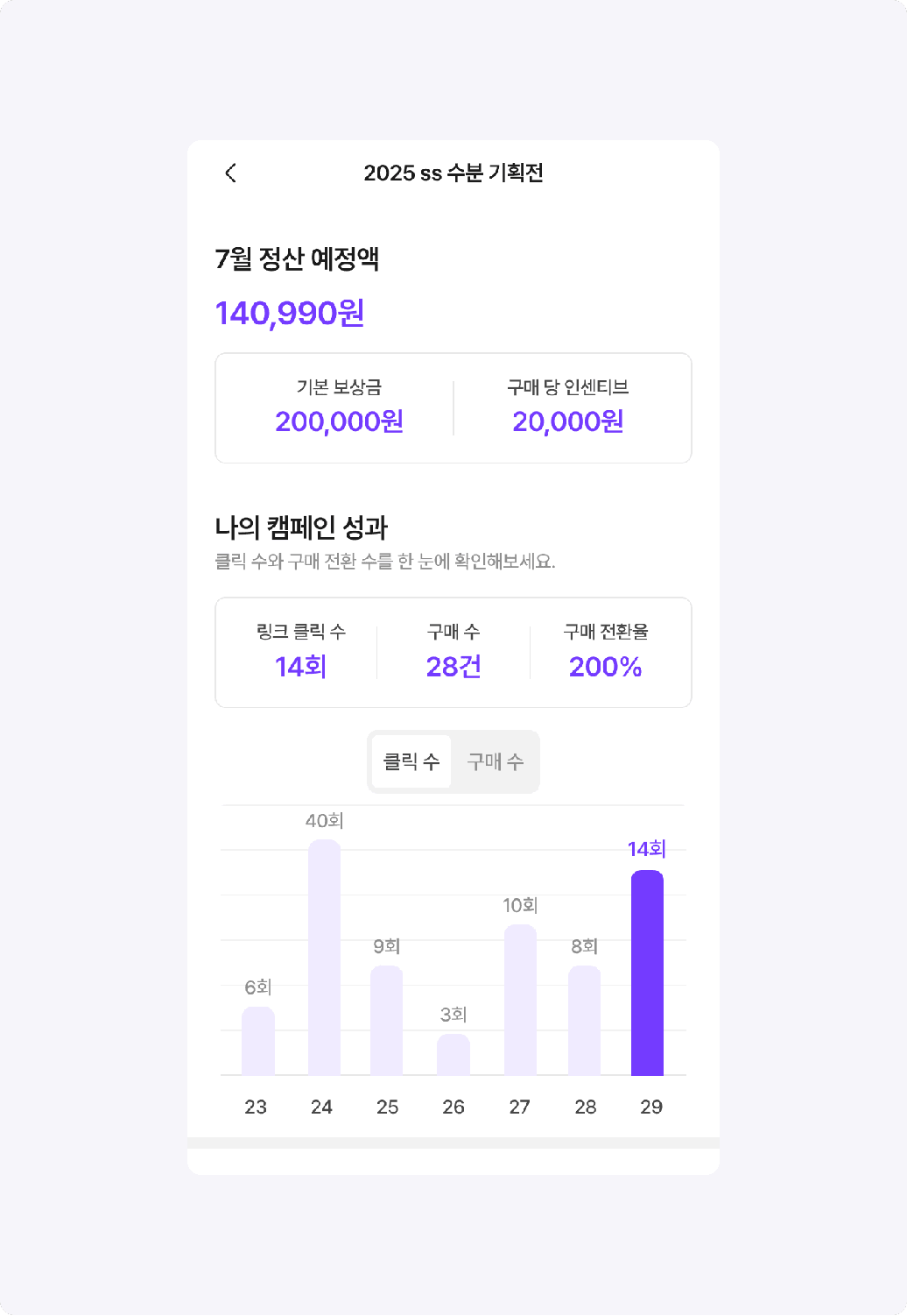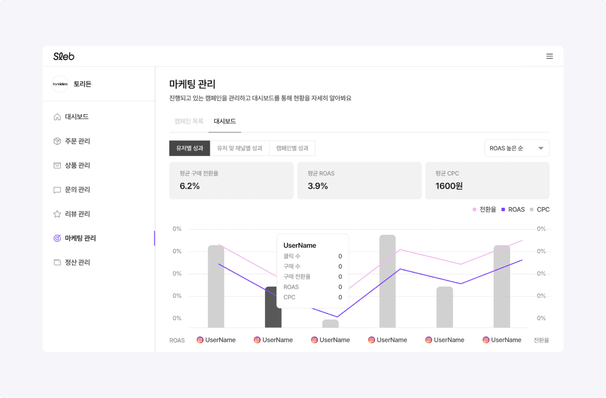 시각화 단계에서는 유저 단위와 캠페인 단위의 두 가지 관점을 모두 지원했어요. 유저 단위에서는 특정 슬렙 메이트가 만들어낸 전환 효과를 비교할 수 있도록 하였고, 캠페인 단위에서는 전체 예산 대비 ROI를 직관적으로 확인할 수 있게 했어요. 이를 통해 브랜드는 단순히 “성과가 있었다/없었다”를 확인하는 것이 아니라, 어떤 유저·어떤 채널·어떤 보상 구조가 가장 효율적인지를 분석하고, 이후 캠페인 기획에 반영할 수 있는 정량적 인사이트를 얻을 수 있게 되었어요.