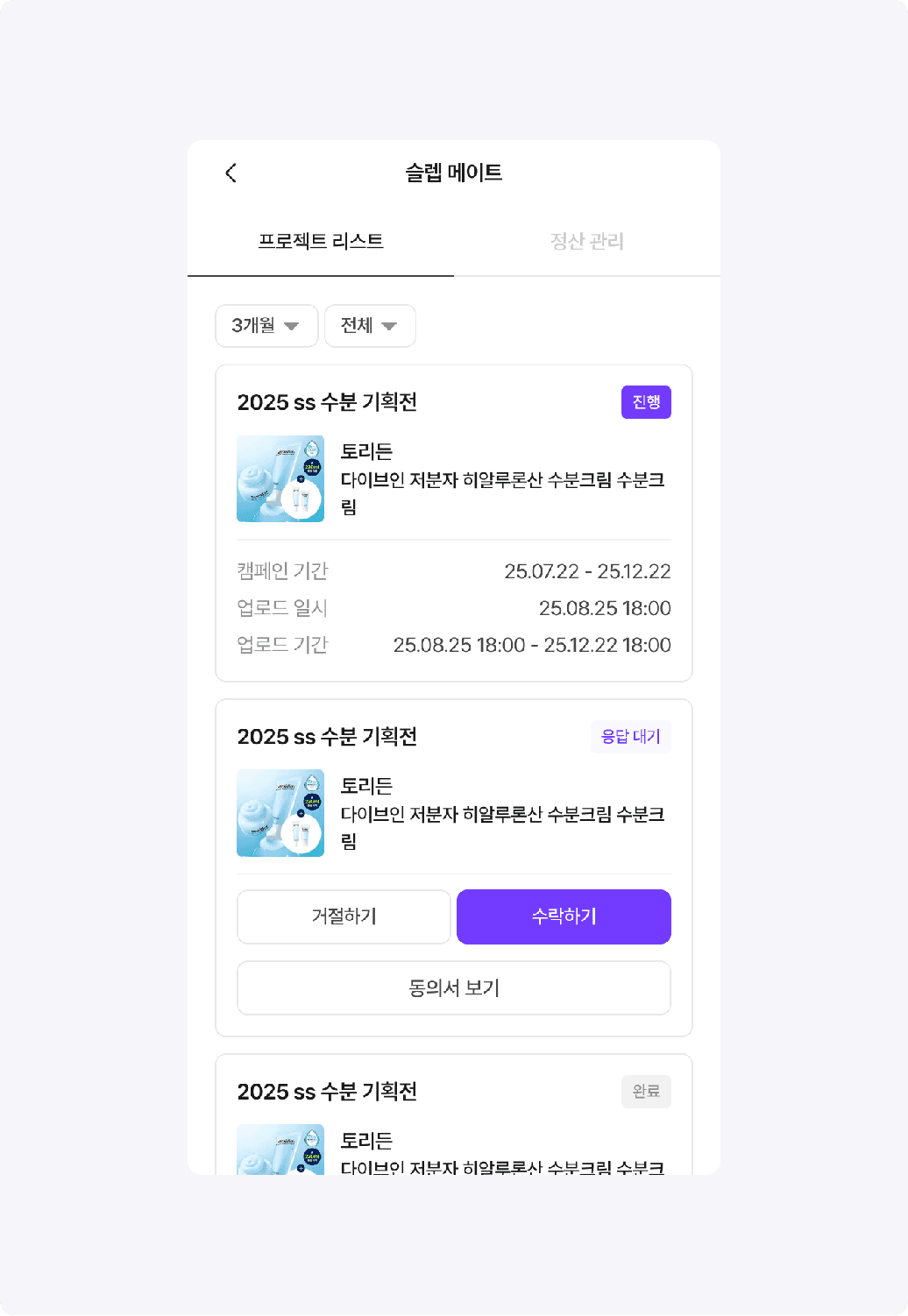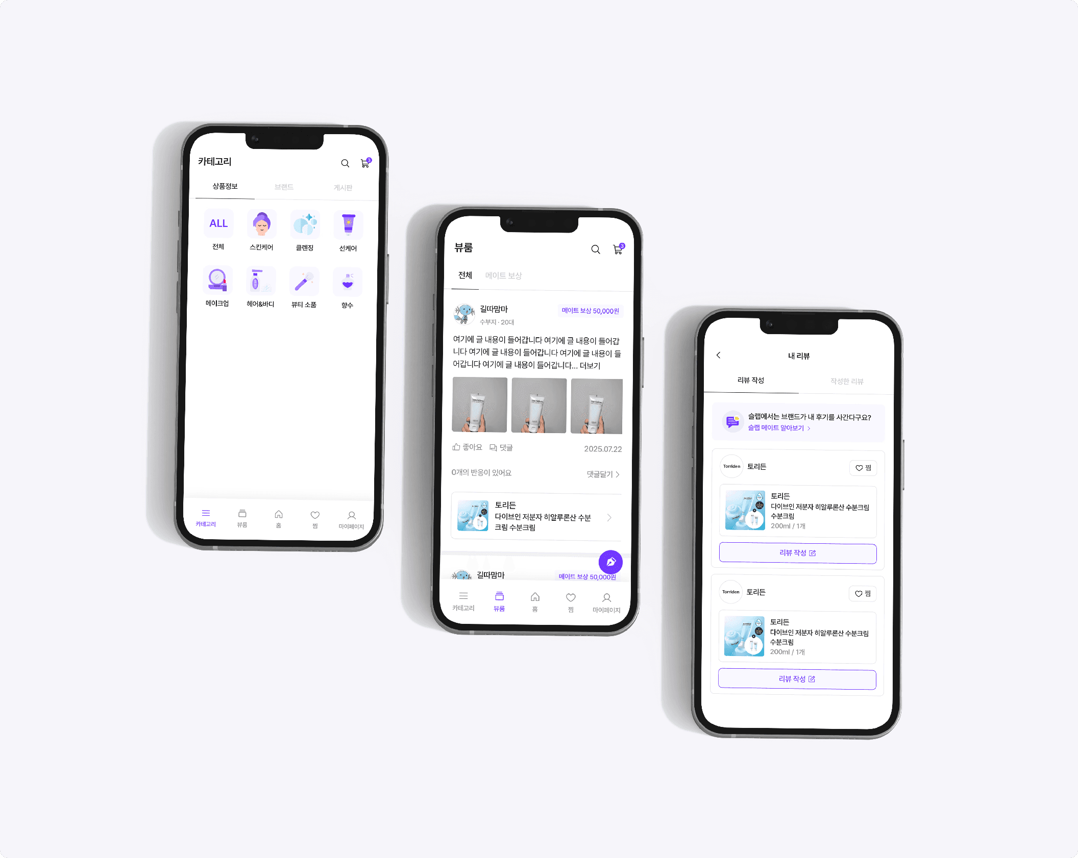 Design 이미 다양한 뷰티 서비스 시장(올리브영, 지그재그, 에이블리 등)이 존재하고 있지만, 슬렙은 여기서 어떻게 차별화를 낼 수 있을지를 가장 많이 고민했어요. 기존 뷰티 서비스들이 화려한 상품 이미지에 집중했다면, SLEB은 브랜드와 슬렙 메이트가 어떻게 협업을 시작하고, 어떻게 보상을 받는지라는 서비스 플로우에 더 집중했어요. 유저에게 가장 중요한 경험은 자신이 단순히 소비하는 데 그치지 않고, ‘자신의 추천이 새로운 가치를 만들어내고 보상받는 과정’을 경험할 수 있다는 점이에요. 그래서 “슬렙 메이트가 추천한 제품”이라는 칩과 배너를 곳곳에 배치해 눈에 잘 띄도록 했어요. 덕분에 사용자는 자신이 단순한 소비자가 아니라, 브랜드와 함께 가치를 만들어가는 파트너라는 인식을 자연스럽게 하게 돼요.