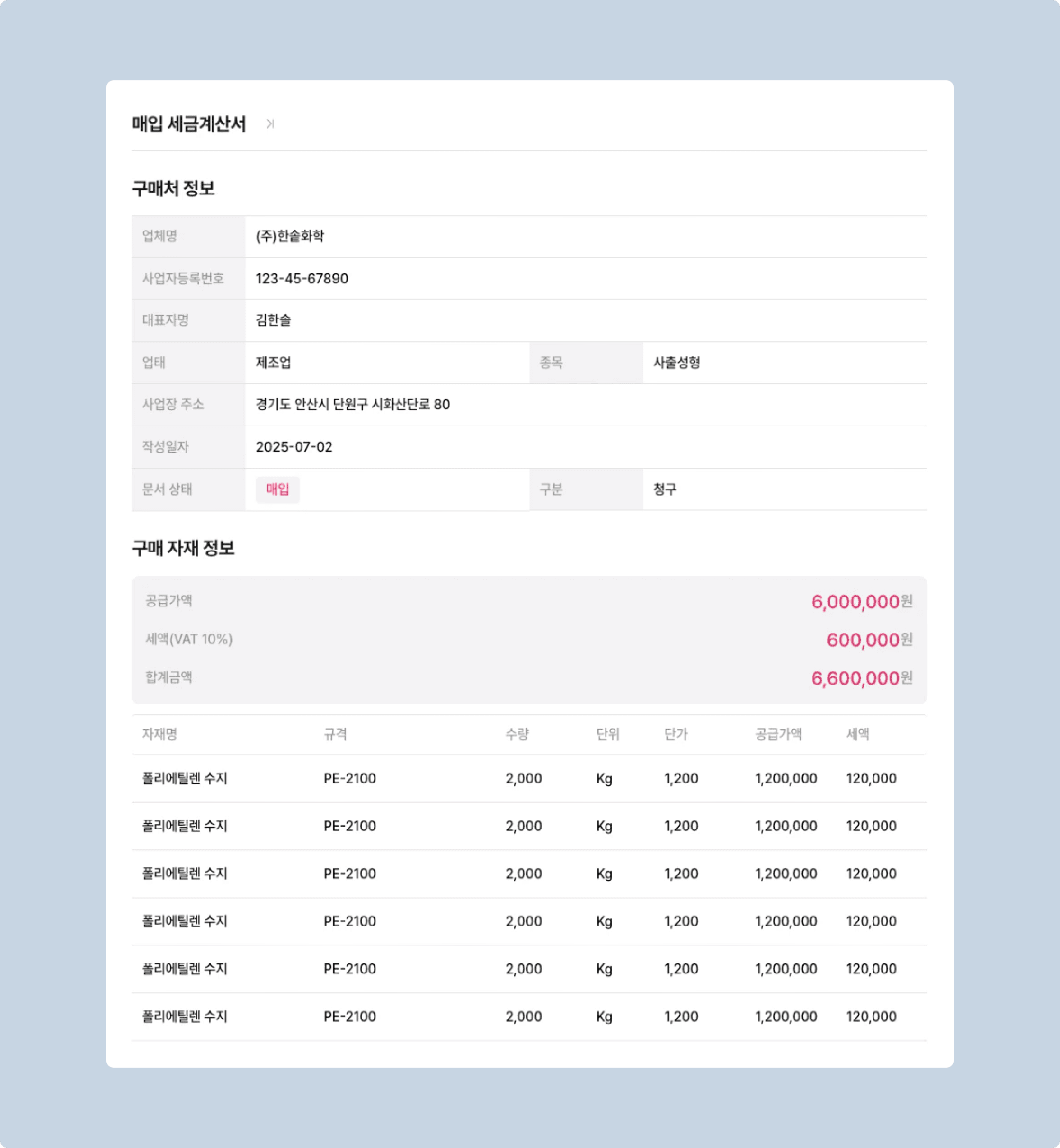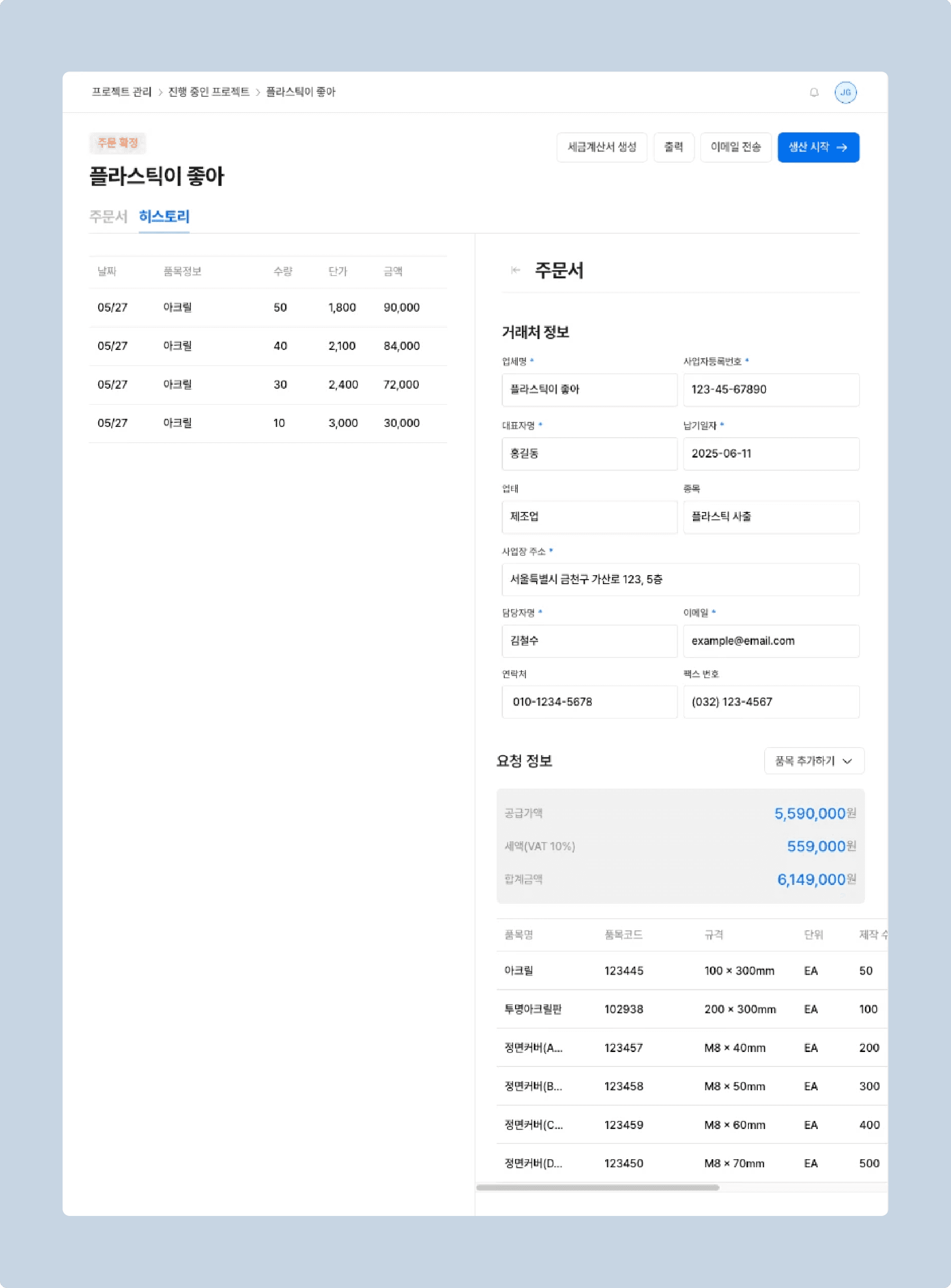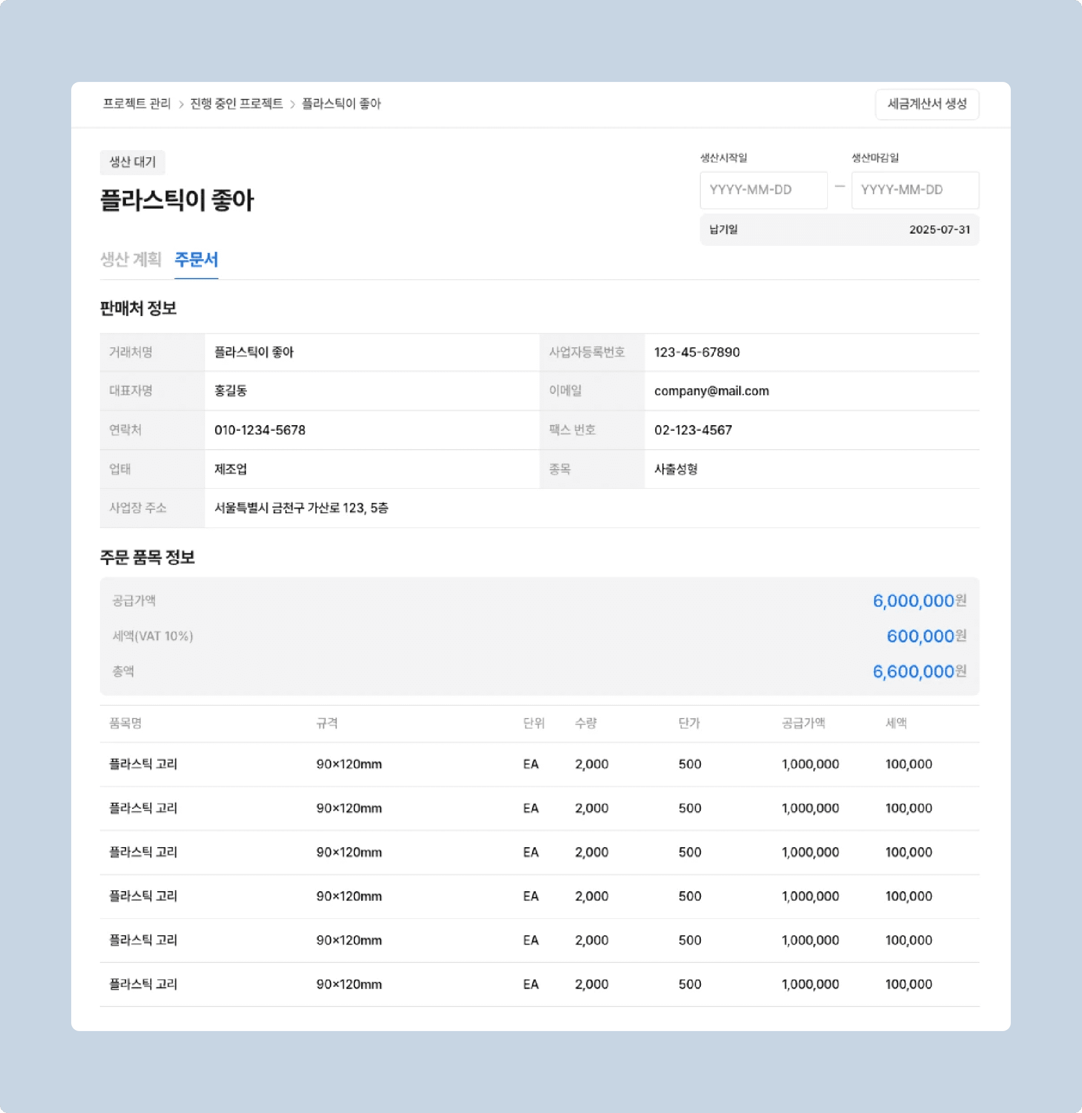 일관된 출력: 견적서 → 발주서 → 세금계산서까지 연결되는 프로세스에서, 각 문서가 서로 다른 포맷으로 생성되는 게 아니라 동일한 데이터 소스를 공유하도록 해, 서식 간 불일치나 수치 차이가 생기지 않도록 했어요.