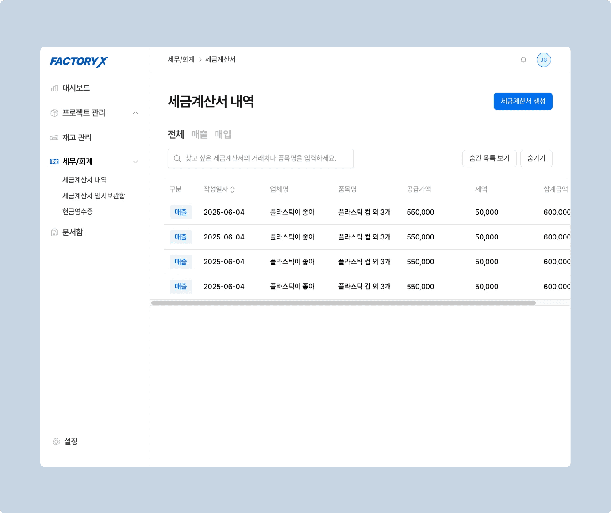 Design 문제를 해결하기 위해 팩토리엑스는 ‘하나의 프로젝트 안에서 생산부터 세무까지 이어지는 통합 흐름’을 구축하는 것을 핵심 목표로 삼았어요. 생산 플로우에서는 설비별 스케줄을 사전에 설정하고, 작업 완료 후 체크 단계를 통해 진행 상황을 관리하며, 생산완료와 납품 단계에서 한 번 더 검증 절차를 거쳐 생산 과정 전반의 오류를 최소화했어요. 이 생산 과정은 재고와 세무 데이터로 자연스럽게 이어지며, 동일한 프로젝트 안에서 세금계산서·거래명세서·약정입금일 관리 등 회계 기능이 통합되어 사용자는 하나의 서비스 안에서 생산부터 회계 처리까지 완결된 업무 사이클을 관리할 수 있어요.